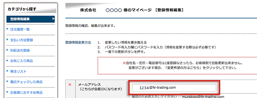 マイページの登録情報編集内のメールアドレス枠に変更ご希望のアドレスをご記入いただき「登録する」ボタンを押していただく事で変更されます。![]() |