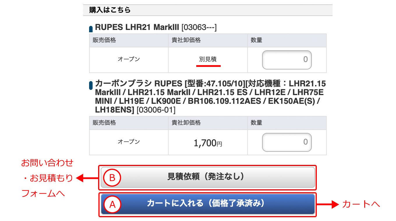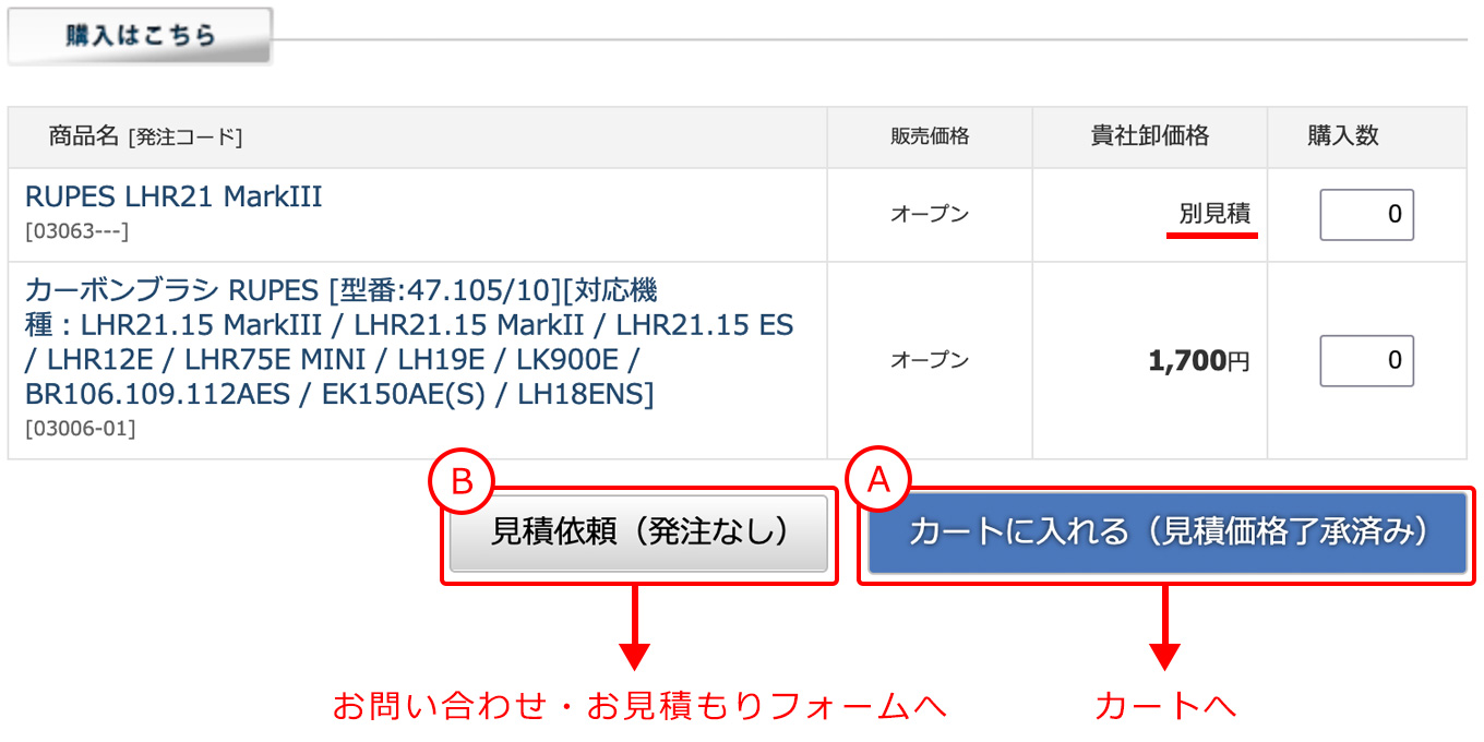 - 「見積依頼(発注なし)」よりお見積もり依頼をお願いいたします。(お手数でございますが、お見積もり依頼は商品ごとにお願いいたします)