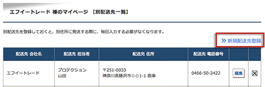 新規配送先を登録する場合は「新規配送先登録」をクリックし情報を登録してください。