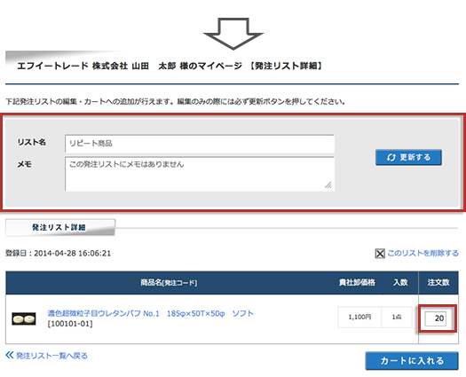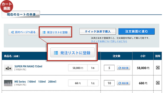 カートの中身のページにある「発注リストに登録」ボタンを押します。
