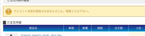 | カードが使えない場合 | 有効期限切れやカード番号が正しくない場合は、カード番号を入力し「注文確定」ボタンを押した時点でエラーが出ます。 再度カード番号・有効期限・セキュリティコードをご確認いただき、再入力してください。