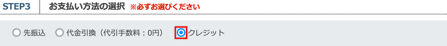 (1)商品の注文画面で「クレジット」を選択してください。