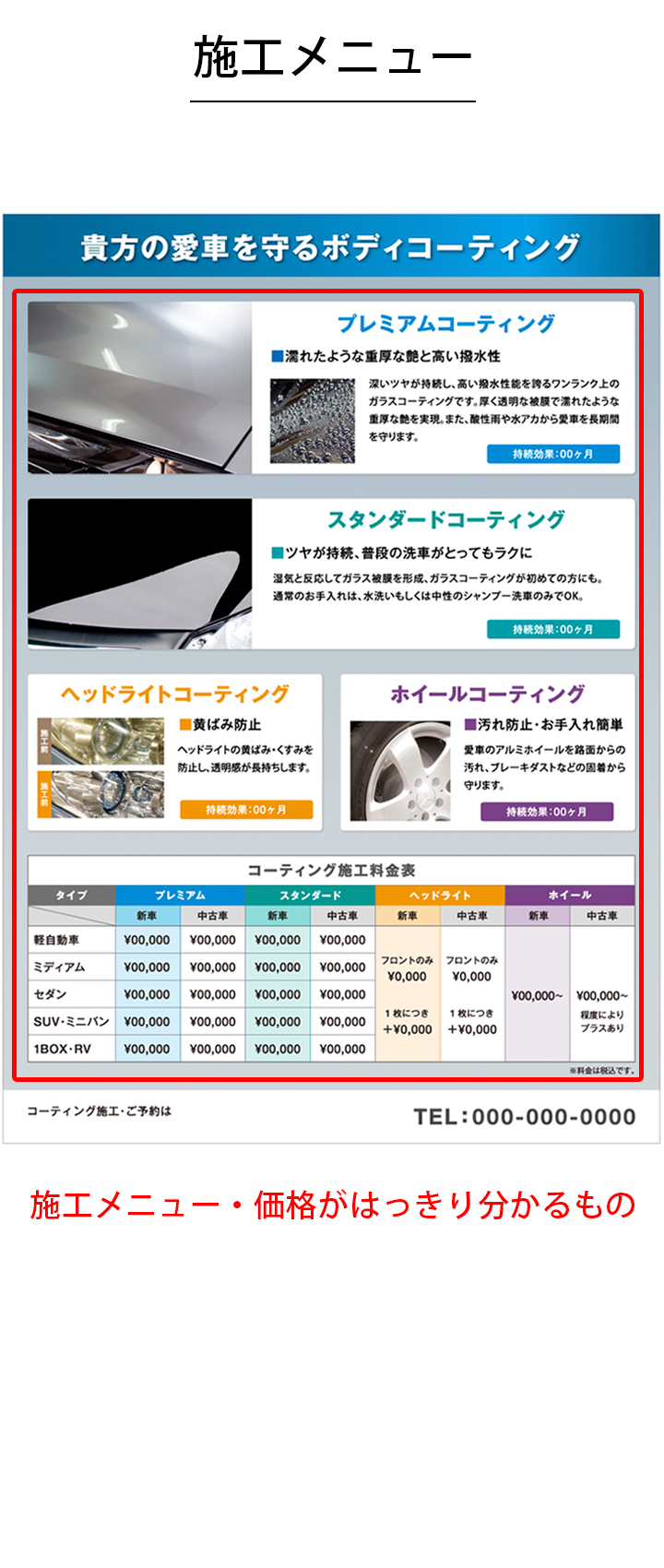 - 施工メニューを記載した看板、POP、リーフレットなどの写真